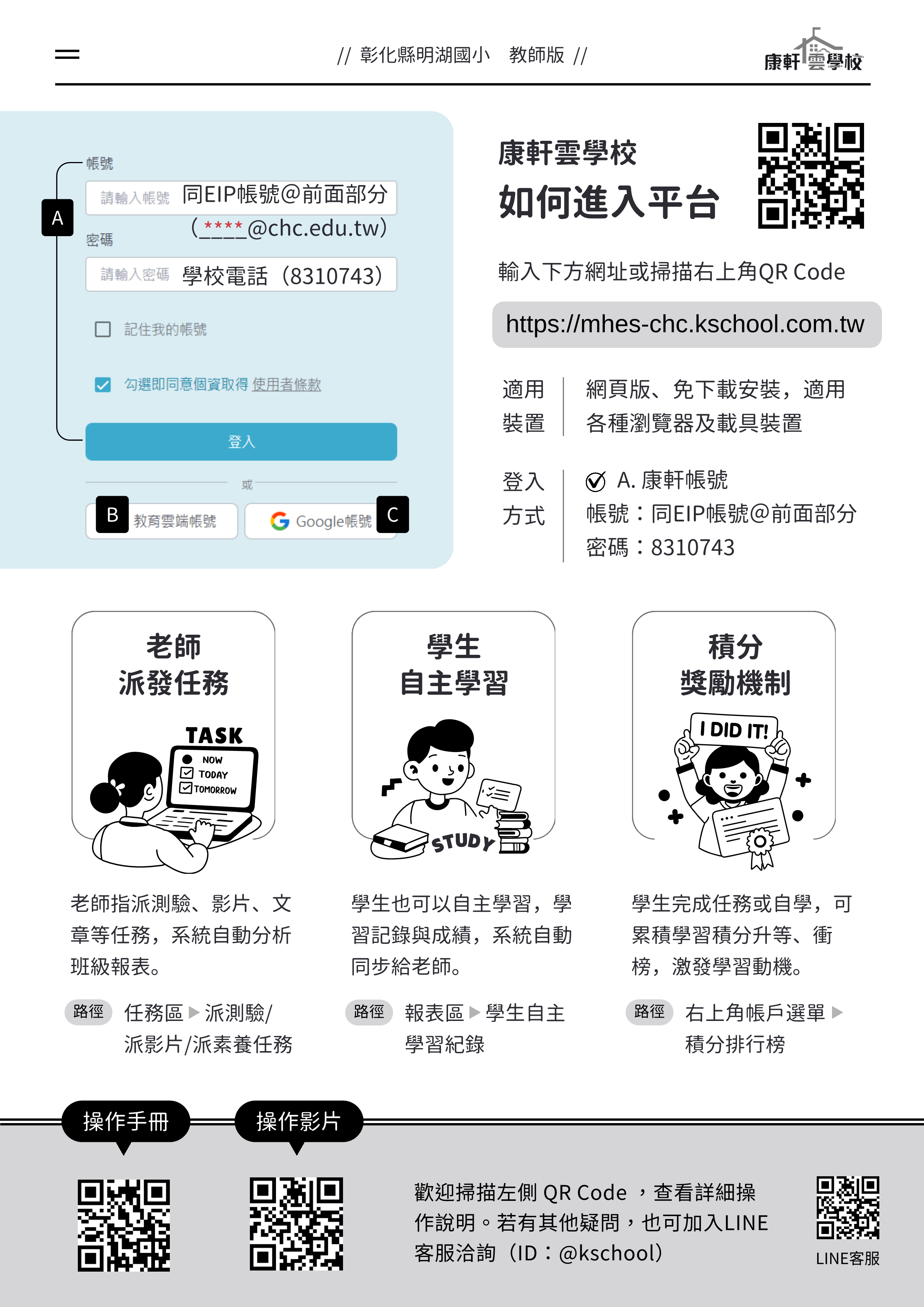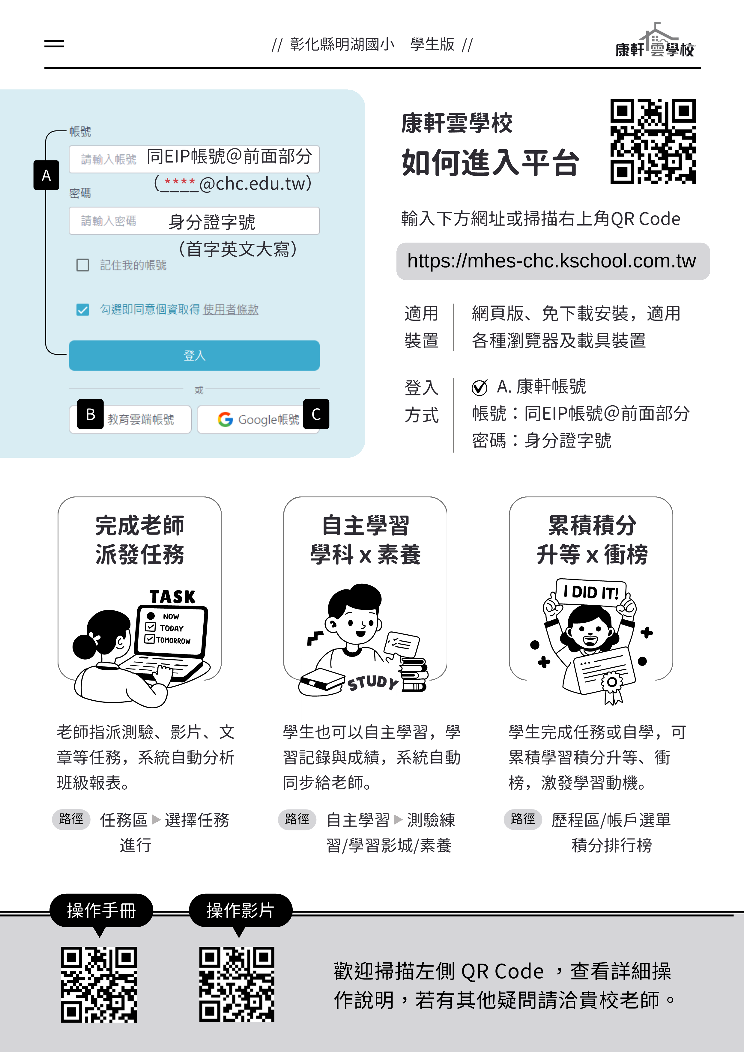 教師端:http://chcgt.renyou.com.tw。 (二)學生端:http://chcgs.renyou.com.tw 五、填答時間: (一)系統試用時間:114年11月20日-21日(系統將於114年11 月22日0時,將所有試用資料全部清除)。 (二)前測時間:114年11月24日至114年12月26日。 (三)後測時間:115年3月16日至115年4月17日。 六、系統操作說明置於本府教育處雲端系統之檔案下載...